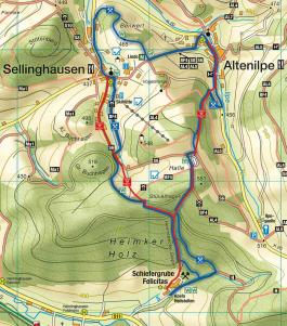 Der Sellinghauser Bergmannspfad ist ein Rundwanderweg mit einer Länge von 6,7 km und einem Höhenunterschied von ca. 300 Metern. Dieser Weg stellt die ungefähre Strecke der Bergleute des 19. Jahrhunderts von Sellinghausen und Altenilpe zur Schiefergrube in Heiminghausen dar. Auf dem Wanderweg stehen insgesamt sieben Informationstafeln, die den Weg der Arbeiter näher beschreiben. |